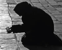 sa sesirom blizu svojih stopala i jednim natpisom na kome
